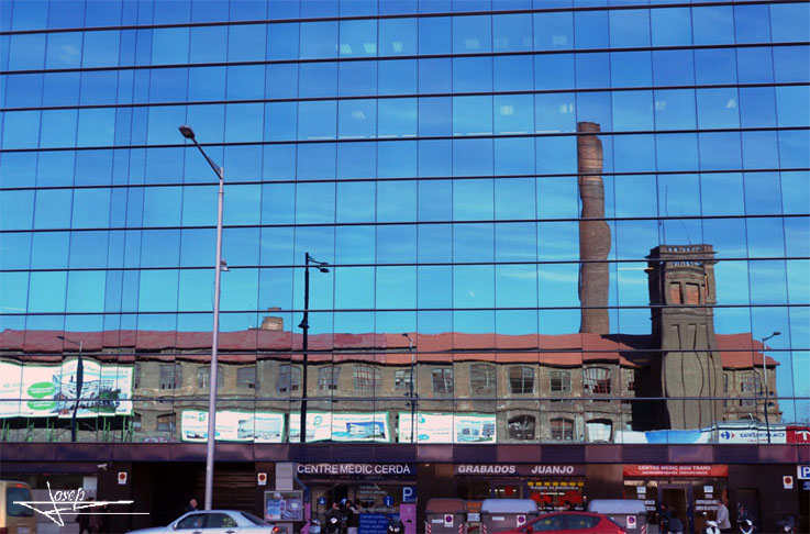 | Les naus de la antiga fàbrica de Can Batlló es reflecteixen en la façana de vidre de "La Campana" a la Granvia de Barcelona |